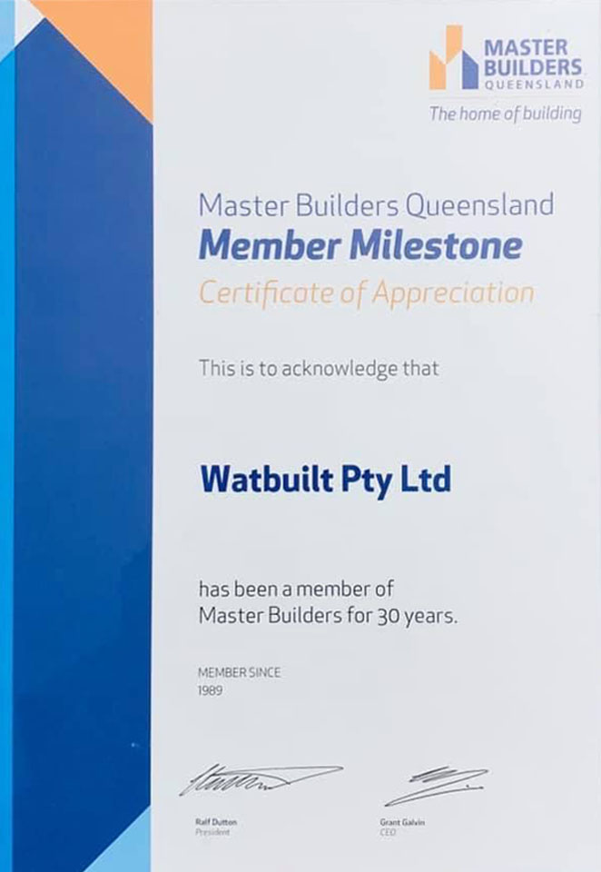 In 2019 Master Builders Queensland acknowledged 30 years of Membership with them